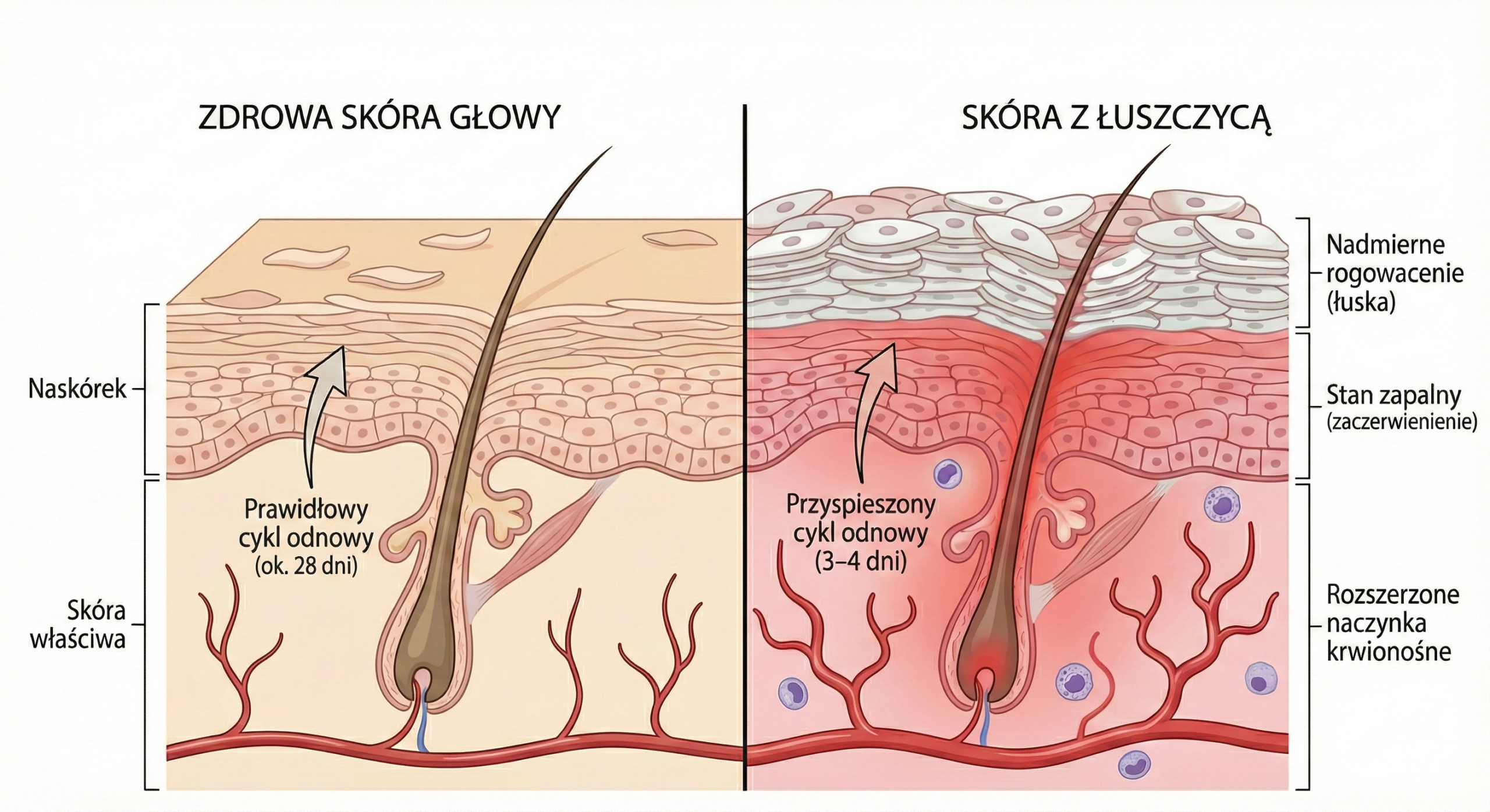 Łuszczyca skóry głowy to przewlekła, nawrotowa choroba zapalna. W jej przebiegu proces odnowy naskórka jest znacznie przyspieszony – komórki skóry nie mają czasu na prawidłowe dojrzewanie, co prowadzi do powstawania grubych, suchych lub tłustych łusek, a jednocześnie do drastycznego osłabienia naturalnej bariery ochronnej. Zmiany często wychodzą poza linię włosów, a ich nasilenie może się zmieniać w zależności od stylu życia, stresu czy diety.